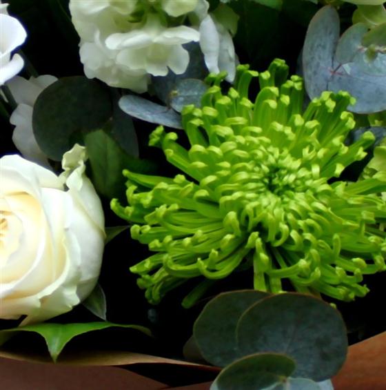 White Arum lilies, white roses, Hydrangeas, Shamrock and Lisianthus.