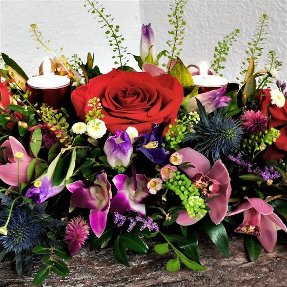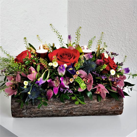 Lovely romantic floral design, a luscious arrangement in a natural round wooden container with candles, perfect for a romantic candlelit dinner.
