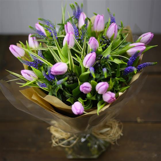 A gorgeous tied bouquet of tulips with filler blooms and seasonal foliage.