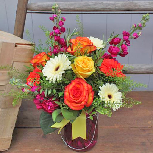 Seasonal blooms styled in a unique glass jar/mini vase.