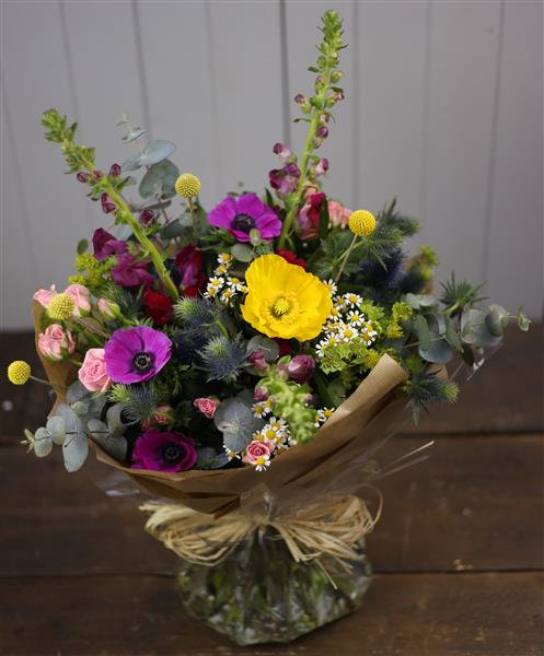 Please note: The image represents a style of bouquet, the flower content may be different. The flowers in the image are pictures when they are open to show them at their peak, we deliver all our flowers closed for longevity therefore the flowers the recipient receives may appear smaller than in the professional photograph.